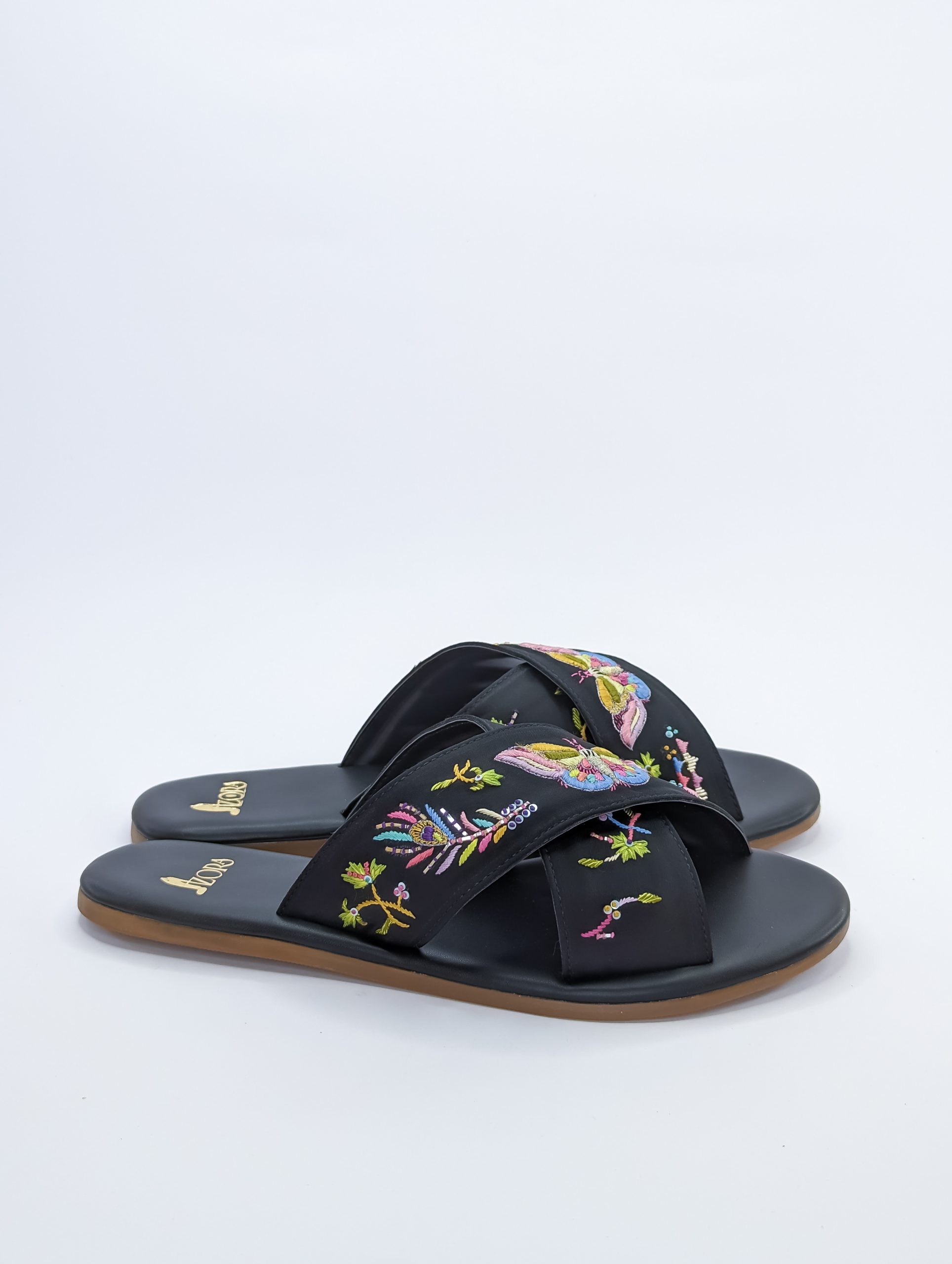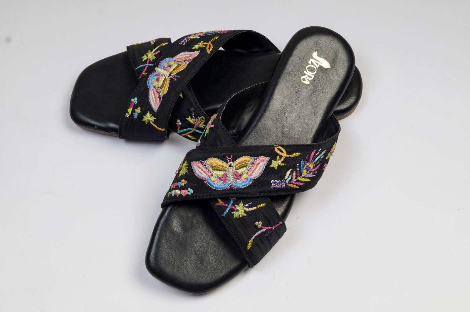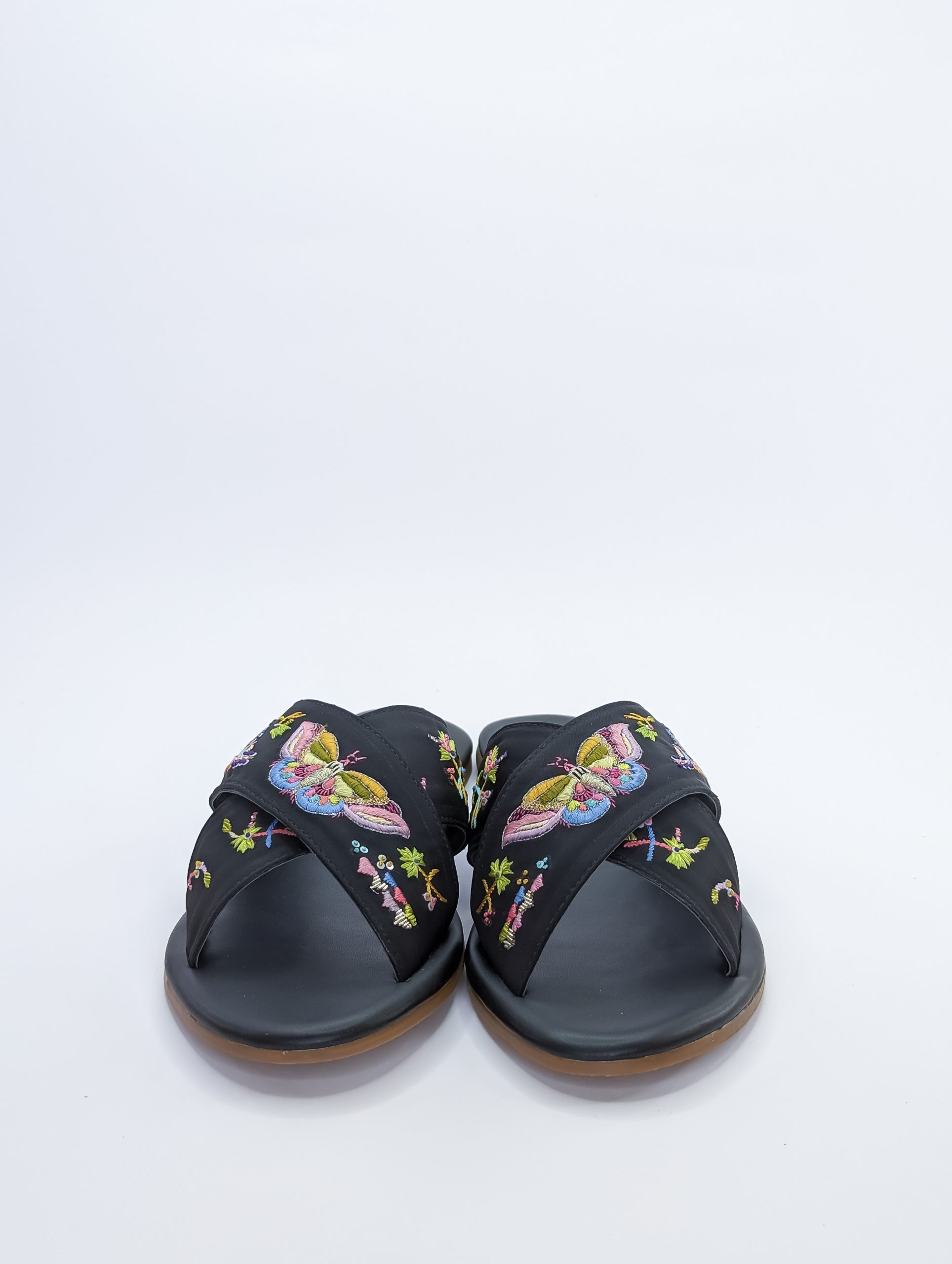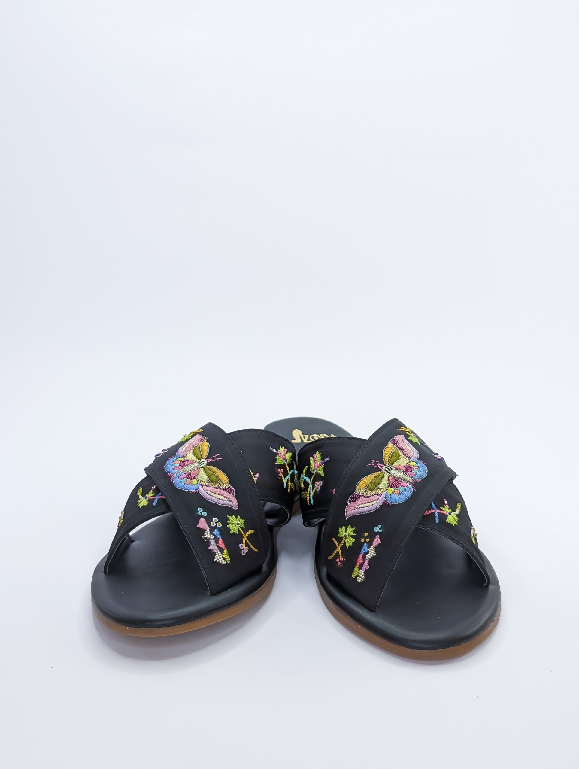 Introducing our butterfly-inspired criss cross footwear! Hand embroidered with incredible thread work, these shoes are a standout with their black base color. Perfect for rocking with denim or dresses, they add a touch of elegance to any outfit. Get ready to flutter your way through the day in style!
